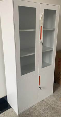 ④两柜门采用对开式,柜门整板无缝折弯、拼接,四周带加强拉筋。柜内带上、下层柜隔板,间距可调,隔板带加强拉筋工艺,上门为整板门框,非拼接裁剪门框,内嵌标准化平玻。门框边角对称无错位、翘角。